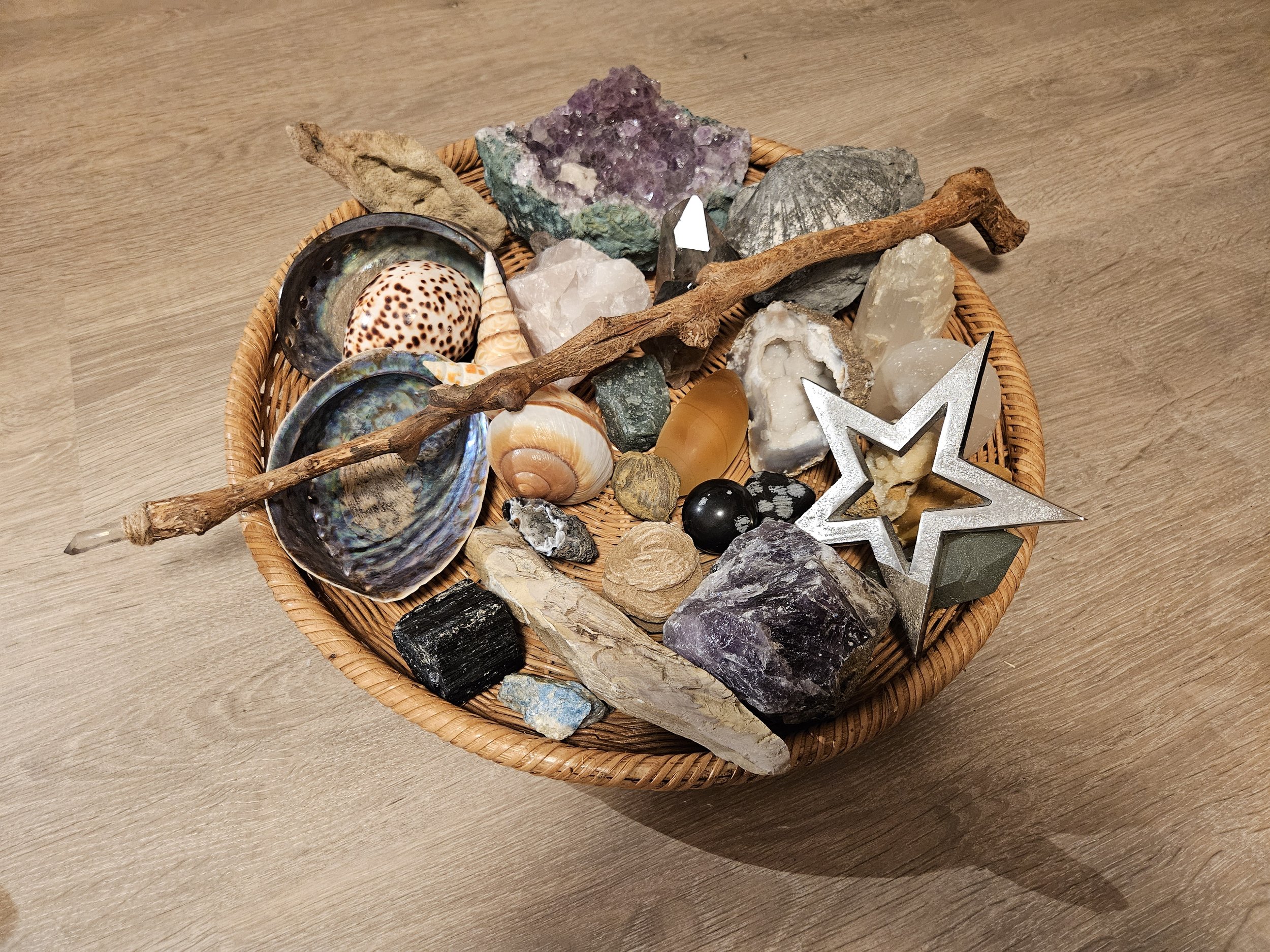 Naturmaterialien & Kristallenergien: Kristalle und weitere Naturmaterialien können intuitiv auf oder um den Körper platziert werden. Sie wirken ordnend, schützend und ausrichtend.